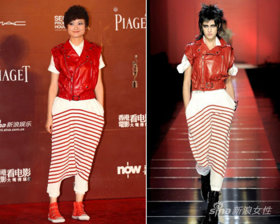 2011年4月第30届香港电影金像奖红毯李宇春红衣惊艳亮相。这件颇受好评的红衣同样是来自高缇耶。Jean Paul Gaultier 2011春夏高级成衣系列:方肩夹克,歌舞女郎内衣,连身衣,海军风格条纹,热带印花裙,皮革摩托骑手夹克,玫瑰印花斗篷,甚至还有一个装饰用的金属胸牌都一一出现。