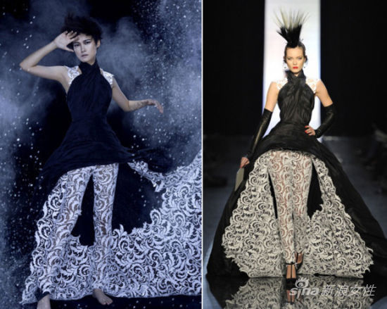 自Jean Paul Gaultier 2011春夏高级定制系列。模特惊悚入天发发髻被李宇春帅气的短发取代,黑色缠裹褶皱与裙摆内的白色蕾丝以及蕾丝leggings产生视觉冲撞。