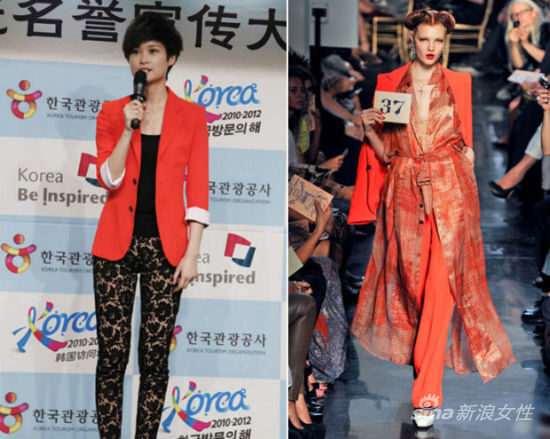 李宇春出任中韩文化宣传大使。红色西装外套来自Jean Paul Gaultier 2012春夏高级成衣系列。性感leggings打底,上装是帅气的西瓜红色西装,外加黑色平底鞋搭配让素日的穿衣风格得以延续。