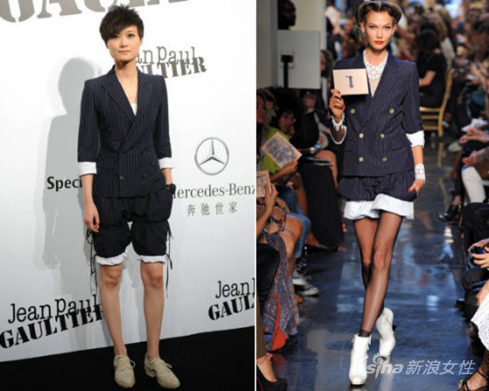 今年5月Jean Paul Gaultier北京首秀。红毯上李宇春身穿Jean Paul Gaultier 2012春夏高级成衣系列。李宇春身穿帅气条纹西服套装,袖口裤腿的卷边设计让搭配更加俏皮。秀场上模特内搭蕾丝衫增加女人味,李宇春白TEE内搭则是一酷到底。