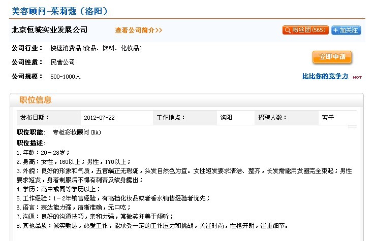 现在可以查到招聘信息了,下半年洛阳王府井听说还要进碧欧泉和SK-II,加上已有的