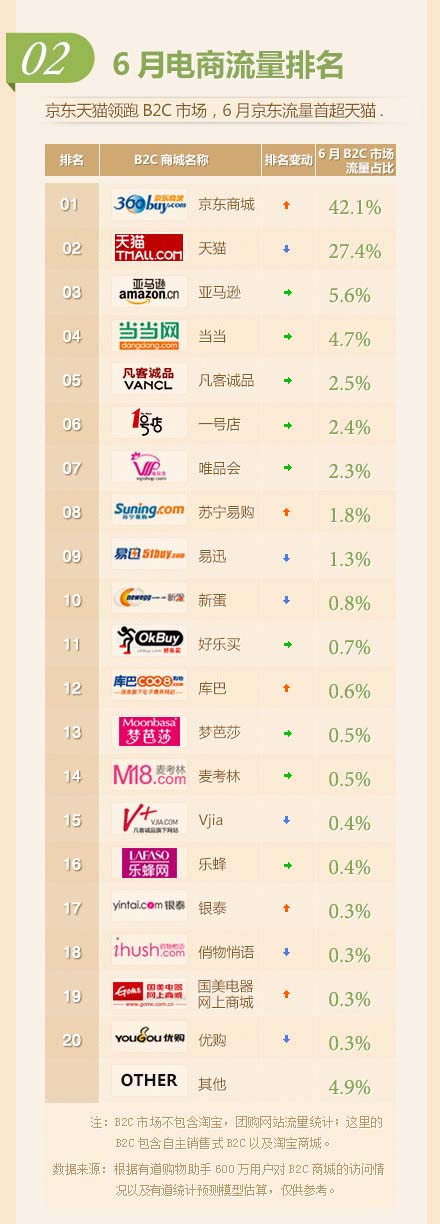 数据显示,京东6月份流量上升明显,占比为42.1%位列首位;天猫商城占27.4%位列第二,并且有所下滑。是亚马逊、当当和凡客诚品分列三四五位。但与京东、天猫的差距较大,均不超过10%。
