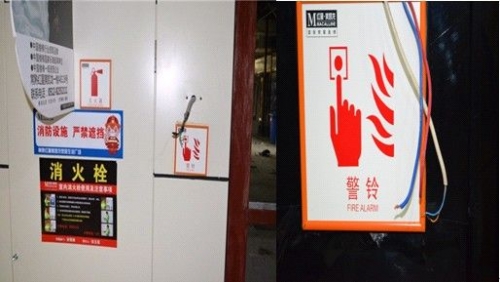 商场内的消防设施由几张贴纸代替 火情报警警铃电线外露从未安装