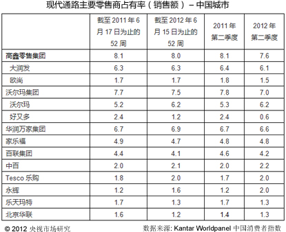 两大领先零售集团:高鑫零售集团和沃尔玛集团在过去一个季度都有明显的份额下滑。面临来自华润万家和永辉等本土连锁强有力的竞争,高鑫和沃尔玛在四个重点城市市场占有率被严重侵蚀。永辉超市,这个一年前在重点城市中几乎不存在的零售商,在2012年第二季度在重点城市达到现代渠道中2.2%的份额。在全国的门店数量达到223家。如此快速的扩张也不是没有代价的,永辉的最新财报显示,尽管其营业收入有约45%的增长,但净利润却同比大幅下滑。
