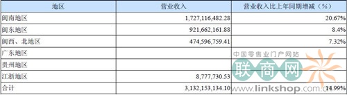 闽南地区作为新华都的业务重心,主营业务收入占到总额的55.14%,新华都仍将通过持续渗透发展,不断强化其优势地位。闽东地区作为公司的发展重心,收入占比29.43%,随着2012年的继续发展,将有望持续、稳步增长。闽西、北地区报告期收入占比15.15%,发展态势良好。 江浙地区:本期新设2家门店,收入占比为0.28%,新华都将着力做好新区域的市场拓展。