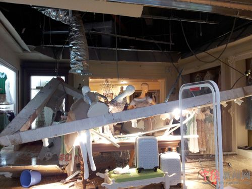 吊顶掉落后店铺内一片狼藉。