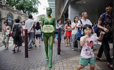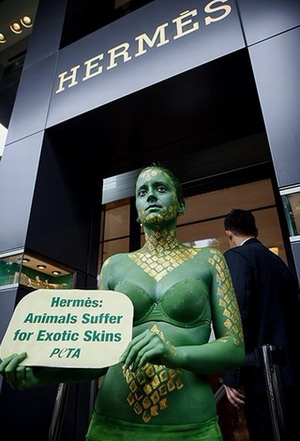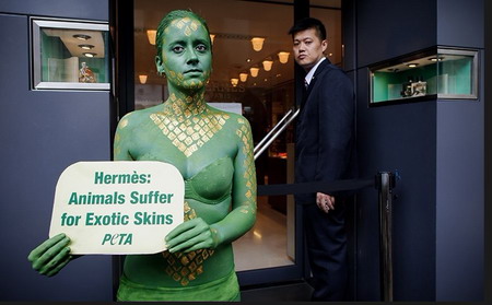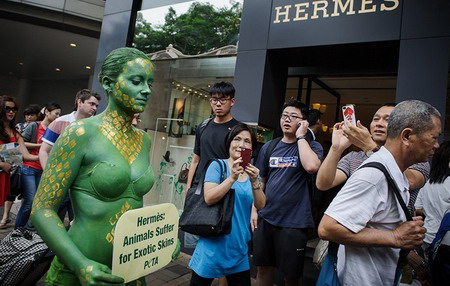8月17日,香港一名善待动物组织(PETA)成员将自己漆成绿色,来到著名奢侈品牌爱马仕的专卖店前举牌抗议,要求爱马仕停止使用动物皮毛制品。 (来源:网易)