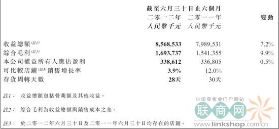 物美商业上半年净利3.38亿 新开31家店 联商网消息:物美商业今日发布2012年中期业绩报告。报告显示,物美商业收益总额为人民币85.68亿元,较2011年同期增长为7.2% ;综合毛利为人民币16.93亿元,较2011年同期增长9.9% ;综合毛利率为20.7% 。净利润为3.38亿元,同比增长0.5%。