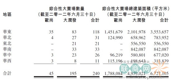 回顾期内,高鑫零售继续保持稳健的门店网络扩充步伐,按计划开设10家全新“大润发”品牌综合性大卖场。在该等新开设的综合性大卖场中,4家位于华东地区,2家位于华中地区,3家位于华西地区,1家位于华南地区。截至2012年6月30日,高鑫零售在全国共有240间综合性大卖场,其中约67%为租赁物业门店,33%以自有物业经营。
