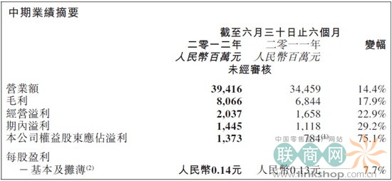 截至2012年6月30日止6个月,高鑫零售的经营溢利为20.37亿元,较2011年同期的16.58亿元增加人民币3.79亿元或22.9%。截至2012年6月30日止6个月,高鑫零售的经营溢利率为5.2%。