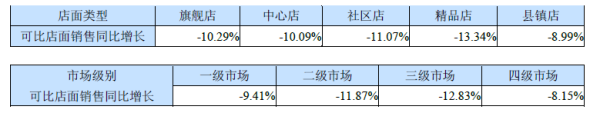 按照店面类型划分,占据了大部分收入的旗舰店和中心店分别萎缩了10.29%和10.09%;而精品店和县镇店分别萎缩了13.34%和8.99%。
