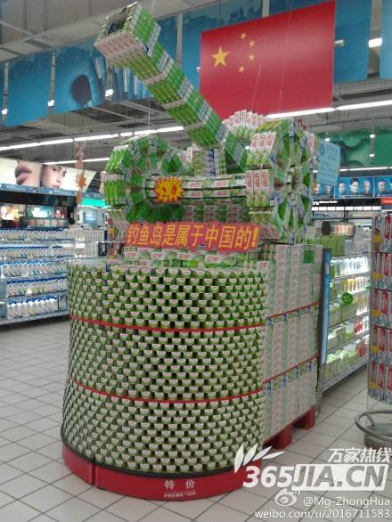 网友都是有心人,近期不少网友爆料称,在买东西的时候发现几个超市的货架和促销台上,商品推积在一起摆起了特殊“造型”,譬如大润发超市将牙膏叠成大炮的形状,放在五星红旗下,并挂上“钓鱼岛属于中国的!”字样;生鲜区放了一个渔夫,身上写着“中国钓鱼岛”。还有合家福生鲜区,做了一个小岛形状标识着“钓鱼岛”,并将五星红旗插在岛上。