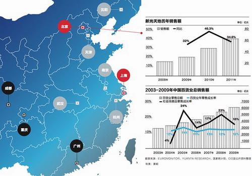 京城时尚新地标新光天地正在创造苹果般拜物教的神奇——“苹果教的伟大光芒会让信徒们开着车子跋山涉水前往同一个幸福的终点站”,乔布斯说。这家在2007年开业的零售商店异军崛起,以每年30%左右的速度增长,其定位和规模奠定了中国高级百货旗舰店的地位。2011年新光天地销售额为65亿元,超越此前四年一直蝉联全国百货单店销售、利润排名第一的杭州大厦(2011年销售额为60亿元),深圳万象城则以年销售额52亿元排名前三。