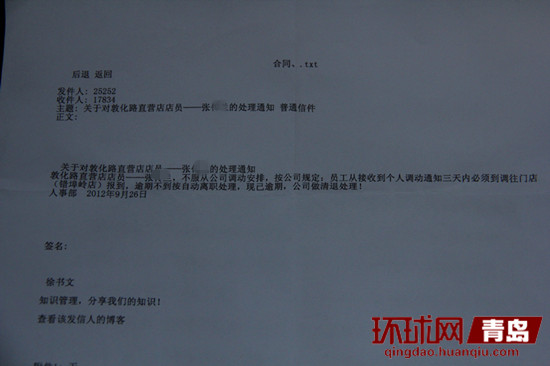 而更让张女士气愤的是,就在劳动部门协调期间,9月26日,利群便利店总部下发通知,张女士因不服从公司调动安排被“清退处理”。张女士对此十分委屈,她告诉环球网青岛频道记者,她向仲裁部门投诉后,9月17日,总部人事通知她将她从敦化路店调到了错埠龄店,但考虑到自己心脏不好,张女士表示无法去离家那么远的地方工作。于是人事人员表示将请示领导再处理此事,张女士等来的却是被辞退的通知。“当初人事说要请示领导再说,后来也没通知我是不是要调动,就说我不服从调动,不允许我继续工作了。”