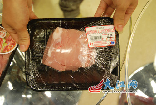 接下来第三步实验,记者再次将买来的猪肉样品装入食品袋中,用手用力挤压,同样,在家乐福、大润发购买的猪肉在人力挤压下有水渗出。