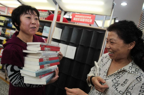 10月12日,北京图书大厦,一名女士一次购买了大量莫言的书。