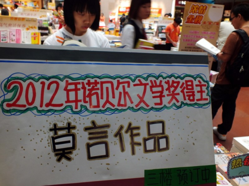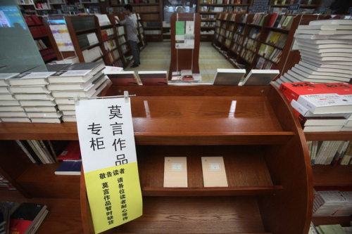 10月12日,浙江宁波书城临时开设的莫言作品专区仅剩下最后两本书,书店也贴出了“莫言作品暂时缺货,请读者耐心等待”的告示。