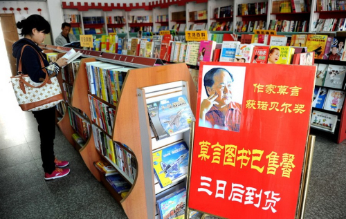 10月12日,广州市购书中心,诺贝尔文学奖得主莫言书籍供不应求,书店原有库存很快被销售一空,购书需要排队预定。