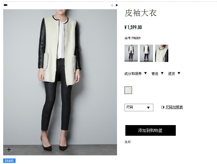 进入ZARA网上商店,富有欧式风格的简洁主页不时滚动着新品大片,左侧罗列着商品分类,打开目标商品后,会发现又是一个简洁的页面。
