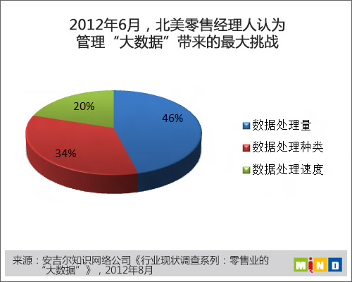 零售商在处理大量数据方面已经有很长时间了,多年来条形码和库存管理任务都需要信息分析。但是“大数据”对那些认为自己拥有良好数据分析能力的零售商也提出了挑战。在受访者中,46%的人认为处理大量数据是其最大的挑战,而34%的人表示仅仅大量的数据类型就占据了自己大量注意力,20%的人认为数据产生过于频繁,对自己来说是个麻烦。