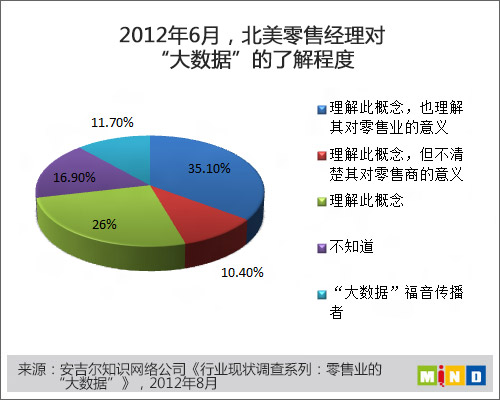 安吉尔知识网络公司(Edgell Knowledge Network)是一家调研及内容服务公司,其在2012年5月至6月对北美零售经理进行的一项调查发现,只有17%的零售经理不知道“大数据”概念。其余的受访者对“大数据”具有不同程度的熟悉,有10%的人说自己理解“大数据”的理念,但不确定此概念如何对零售产生影响。