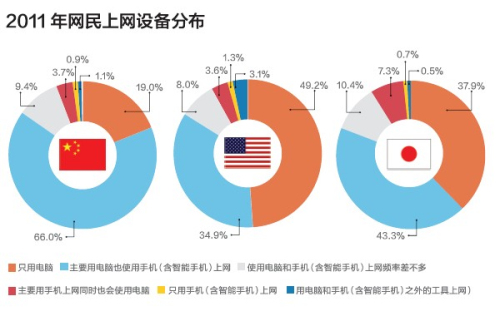 (1)网民上网设备。只用电脑或主要用电脑上网的网民比例合计,3个国家都是80%以上。另一方面,有使用手机上网经历的比例,日本61.7%、美国47.8%、中国80%。