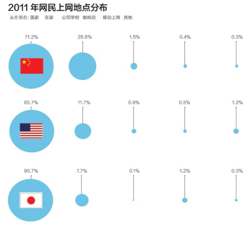 (2)网民使用网络的主要场所,3个国家都是在家上网的人居多,日本90.7%、美国85.7%、中国71.2%。其中中国3成左右的人主要在公司、学校上网。