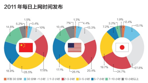 (3)美国、中国一天的上网时间超过3小时的网民比例超过6成,而日本仅为32%。