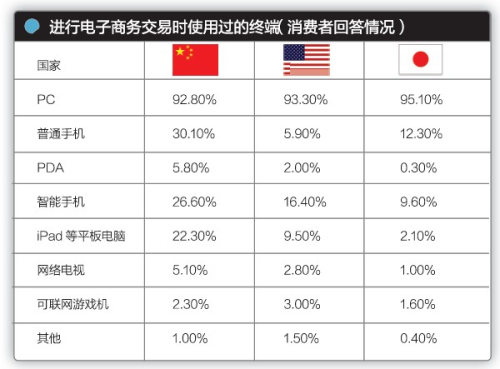 3个国家都有9成以上的消费者通过PC进行电子商务交易;另外,从使用过普通手机、智能手机、平板电脑等移动终端进行交易的消费者比例来看,中国79%、美国31.8%、日本24%。(编者注:我们怀疑这个数据是把回答使用过普通手机进行电子商务交易的用户的比例和使用过PDA、智能手机用户的比例简单相加得到的。如果按照同样的逻辑把使用过PC和手机的用户比例相加会超过100%,显然不合逻辑。当一个人使用过多种终端的时候,简单相加即重复计算。)