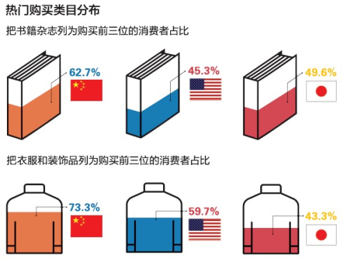 中国消费者从美国和日本购买商品都有着同样的特点。购买最多的是衣物和装饰品,其次是影音设备(包括游戏机),再次是电脑软件、游戏软件等。中国消费者通过跨境电子商务渠道进行购买的理由主要是“在国内买不到”、“质量好”、“先于国内销售”、“价格比国内便宜”等。