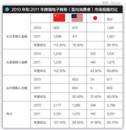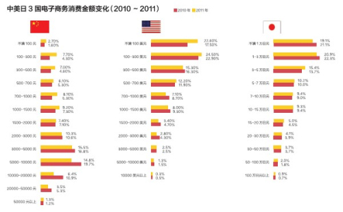 2011年美国消费者和日本消费者跨境电子商务购买额,与2010年相比有所减少。其中日本消费者的购买额大幅减少。而中国消费者的跨境购买额有所增加。