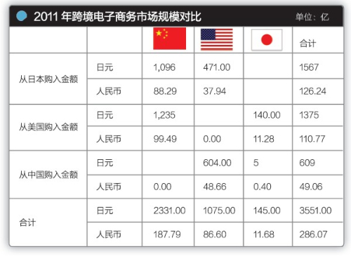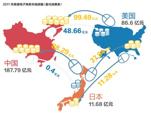 2011年跨境电子商务购入金额中国排第一,卖出金额中国仅仅49.06亿元,不足日本、美国的一半。