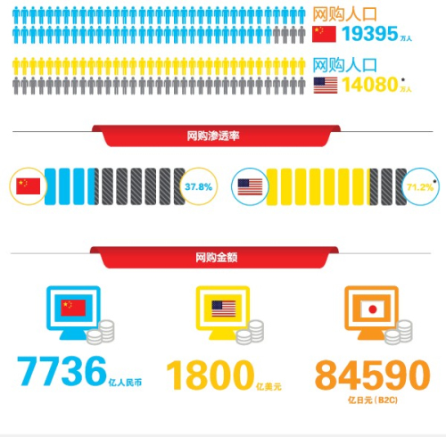 2011年,美国网络购物人数是1.41亿人,电子商务使用率71.2%。根据comScore的调查,2011年美国电子商务市场规模为1664 亿美元。美国电子商务市场,虽然2009年受金融危机影响,首次出现负增长,但是2010年便扭转颓势达到历史最高销售额,目前呈现强劲增长态势。根据CNNIC的报告,2011年中国网络购物人数为1.94亿人,电子商务使用率37.8%。根据艾瑞报告,2011年中国电子商务市场规模达到7736亿元人民币。根据日本政府报告,2011年日本B2C电子商务市场规模为84590 亿日元,电子商务使用率在4成左右。