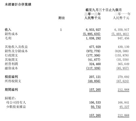 联商网消息:北京京客隆公布,截至9月底止九个月收入69.34亿元人民币(下同),按年增长9.2%;毛利增长9.6%至10.38亿元。零售业务毛利率由16.4%下降至15.1%,批发业务毛利率由11.0%上升至12.5%。录得纯利1.07亿元,下降36.1%。