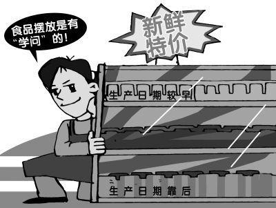 “新鲜食品靠后摆”的陈列方法,在各家超市均不鲜见。不少顾客选购时没细看生产日期,拿起放在最前面或最上面的食品就走。一家大型连锁超市的人士坦言,有的食品摆放有“新鲜规则”:生产日期靠后的,一般被放在货架靠后处,生产日期较早的摆放在前面方便拿取处,加大顾客“选取率”,以便尽快走货。但所售商品都确保是在保质期内。