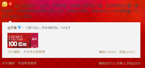 11月11日消息,天猫刚刚宣布,截至今日下午13时38分,天猫双十一促销的支付宝总交易额达100亿,完成了先前预期的目标。