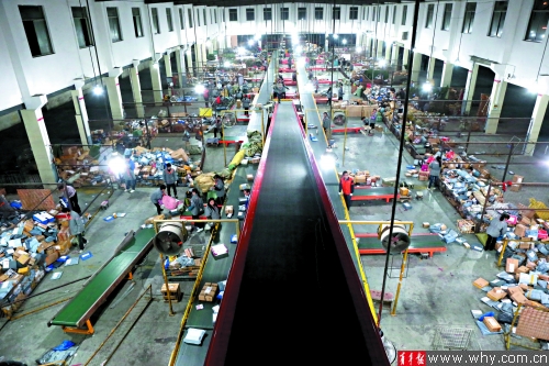 昨天,晚7点45分,工人到达岗位分拣快递货物。
