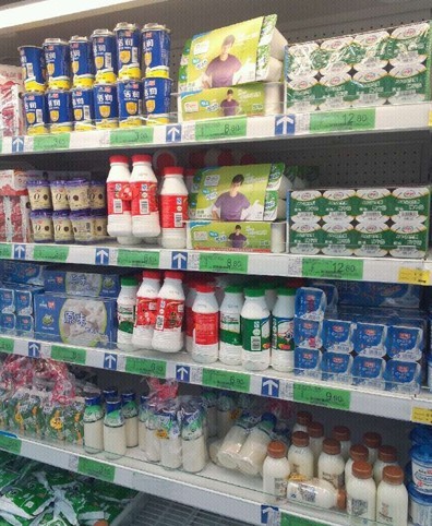 微博除了爆料“旧前新后”外,还爆出了便宜的物品会摆放在货架下面,而与人视线同高度的商品往往利润高。在家乐福超市,记者发现了类似的现象。在酸奶的冷藏架上,记者发现,一款售价为12.8元的伊利牛奶摆放在与人视线平齐的位置,而在其下面,依次摆放着售价为9.9元和6.5元的两款酸奶。