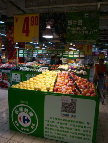 二维码运用于蔬果,源于家乐福在中国推行农产品可追溯信息系统的建设。可追溯体系“从田间地头到餐桌”的运用在欧洲已有多年的历史,该系统以商品种植生产的详细信息登记为基础,从源头抓质量,详细记录种植过程中选种、施肥、除虫害、加工、仓储、运输全过程数据,从而达到全面质量安全管理。只要把产品条码输入电脑系统的公共信息平台,就能查询到产地、包装日期、净重、等级、农户信息等。随着智能手机的普及,二维码能帮助人们更方便快捷搜索到以上信息,增加对食品安全的信息,也便于生产监控和问题查找。目前这一技术在家乐福上海和广州的门店试行,仅运用于苹果、梨、蜜柚等少数全国农超对接采购的水果品类。