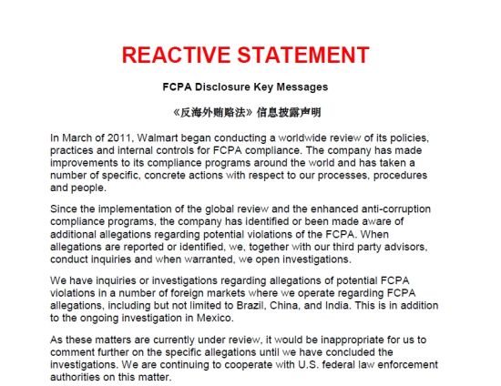 沃尔玛声明称,2011年3月,沃尔玛开始在全球范围内对公司的政策、实践以及内部管控进行全面回顾,确保其符合美国《反海外贿赂法》(简称FCPA)的规定。公司改进了在全球各地的合规项目,而且在尊重公司程序、流程和个人的前提下采取了许多切实有效的具体措施。