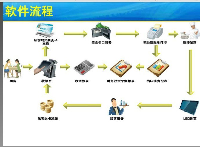“ 融商软件美食广场餐饮管理系统” 是融商专门针对美食广场消费人群集中,用餐消费时间短、出菜要求效率高等特点开发的餐饮管理系统,能满足统一管理、摊位租赁联营、综合购物中心刷卡与美食广场专区刷卡相结合的多种经营方式。用户先购卡,后消费,使消费者通过使用一张 IC卡在美食广场里任意消费点进行消费, 极大地提高了会员的忠诚度和满意度。同时也方便餐饮企业对资金进行统一管理、统一分配。