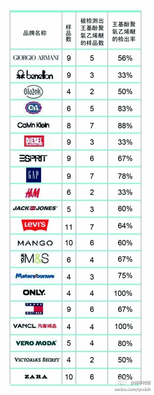 绿色和平发来的《全球时尚品牌有毒有害物质残留调查》报告显示,今年4月,绿色和平在全球29个国家和地区购买了141件服装样品,包括Armani、C&A,CalvinKlein、Esprit、Gap、H&M、ZARA、美特斯邦威、凡客诚品等20个时尚品牌,种类包含男装、女装、童装。其中,89件被检测出环境激素壬基酚聚氧乙烯醚(NPE),几乎涉及全部品牌;4件被检测出高浓度的环境激素邻苯二甲酸酯;ZARA的两条牛仔裤被检测出了能分解出致癌芳香胺的偶氮染料,它们分别在匈牙利和黎巴嫩出售。