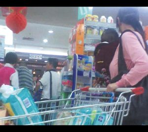 9月20日,离中秋节还有9天,家乐福超市白云路店里前来选购的市民络绎不绝。下午6点40分左右,赵先生指着一名穿粉红色衣服、怀抱小孩的女子说:“看,她们来了!”