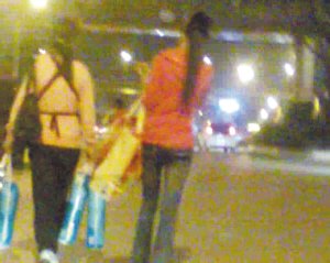 “红衣女”拎着最重的一个大袋,走得并不快;抱孩子的“粉衣女”提着3大袋婴儿纸尿裤,走在最前面,她时不时用手招呼,示意“红衣女”赶紧跟上。