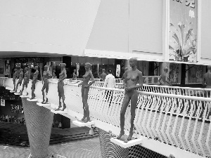 上午10时许,天空中下着蒙蒙细雨,路上的行人步履匆匆忙忙。但市民周先生还是放慢脚步回头看了一眼彩虹天桥上红色的裸体模特。记者发现,位于蓝天路和海秀东路交汇处的一家商场2楼的一个入口和彩虹天桥相连,长约4米的引桥护栏两边站着16名全身被涂成红色的裸体女模特,十分醒目。这些裸体模特高160厘米左右,身材苗条,眼睛望着远方,全身一丝不挂,胸部隆起,有的双手叉腰、有的双手抱在胸前、有的自然下垂,动作十分性感妩媚。记者看到,路人的回头率那是相当的高。