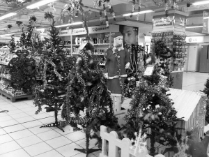 昨天,记者前往世纪联华市府大道店采访,还没进超市,便看到入口处一组圣诞老人主题的摆景非常精美漂亮。而在超市百货区的显眼处,开辟了一个“圣诞专区”,小到圣诞袜、雪花、贴纸、铃铛、玩偶、彩灯、圣诞袜帽等,价格也从几元到几十元不等。大到各种圣诞树,按高度的不同,售价从60元到100多元都有。