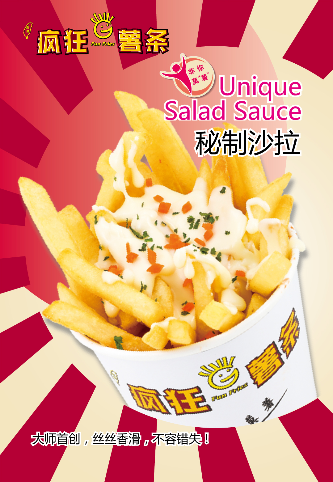 招牌芝士2意式番茄3日式芥末4咖喱椒盐5川香麻辣6韩国风情7秘制沙拉8经典原味9特色培根10 BBQ烧汁11黑胡椒汁12蜂蜜甜酱13水果色拉 14香浓酸奶15法式肉松16清凉抹茶17浓情巧克力18台式沙茶19墨西哥肉酱20疯狂辣酱还配以鸡排、鸡腿、鸡翅、猪排、薯格、薯角、薯块、洋葱圈、地瓜条、紫薯条和特色饮品系列附带综合经营,弥补了产品的单一性缺陷。疯狂薯条经过特殊的工艺,精密的配方,可调配不同的口味,多样化的特色。注,总部后续会根据季节开发不同口味,供应加盟商免费学习。