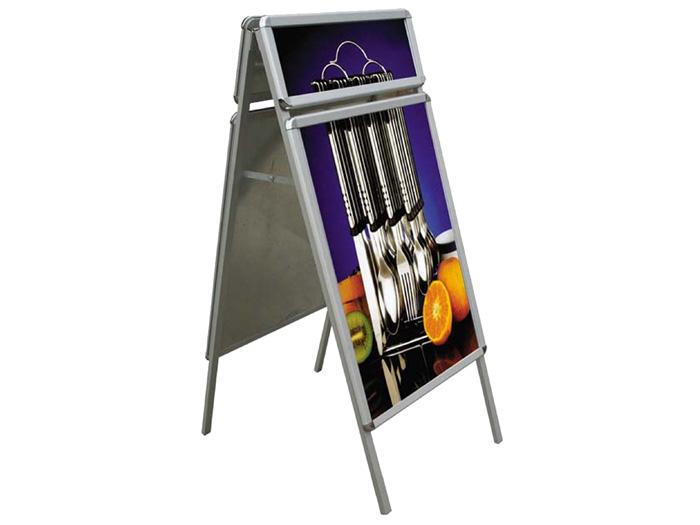 此款海报架由全铝合金材质框架制成,用作户内和户外使用;产品设计上充分考虑到整体统一性,故在眉头和主体框架上都为同种材料制成;并可制作多种尺寸;