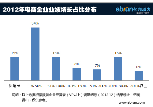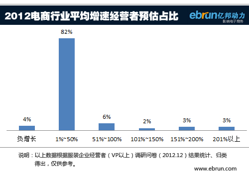 亿邦动力网2013年电商景气调查数据显示,超过半数以上的企业表示增速可达到100%以上,其中认为企业可实现两到三倍增长的占15%,有6%左右的企业相信增幅可达到三倍以上。由此判断,2012年电商整体表现尚属乐观。