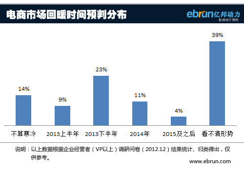 亿邦动力网2013年电商景气调查数据显示,有接近23%的电商企业高管预测,市场复苏要等到2013年的下半年;认为2013年市场依然低迷者则占到15%;仅有9%的电商高管乐观的相信2013年上半年就可以等到电商春天。